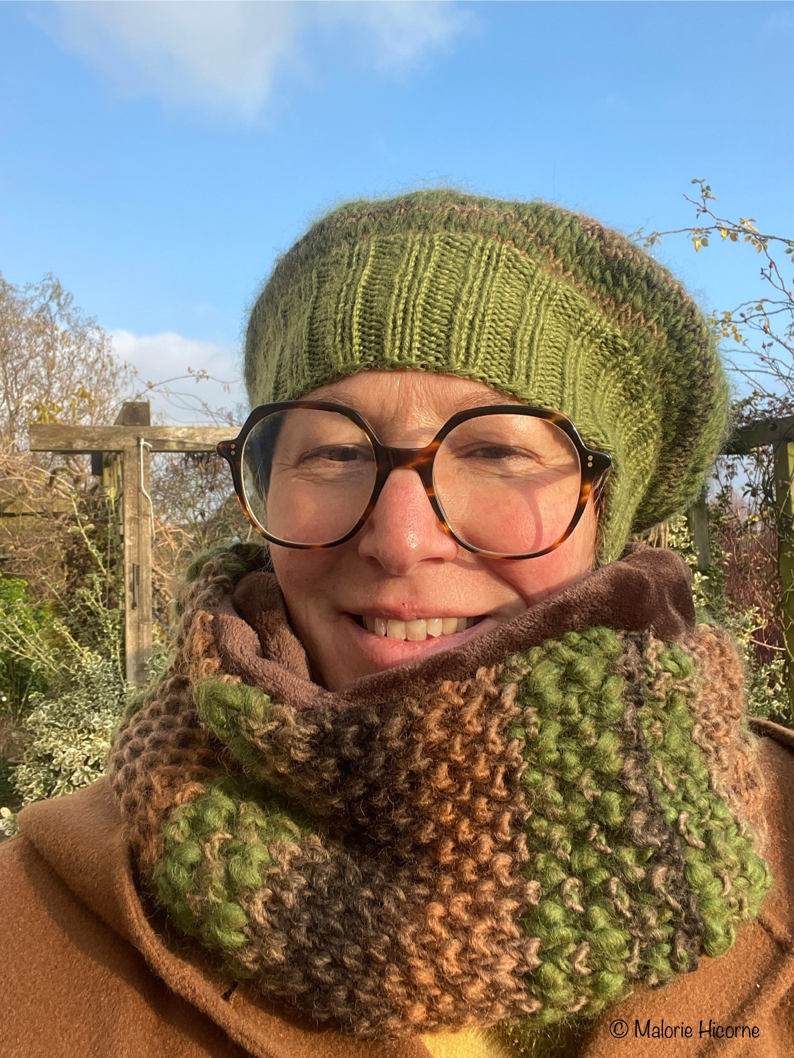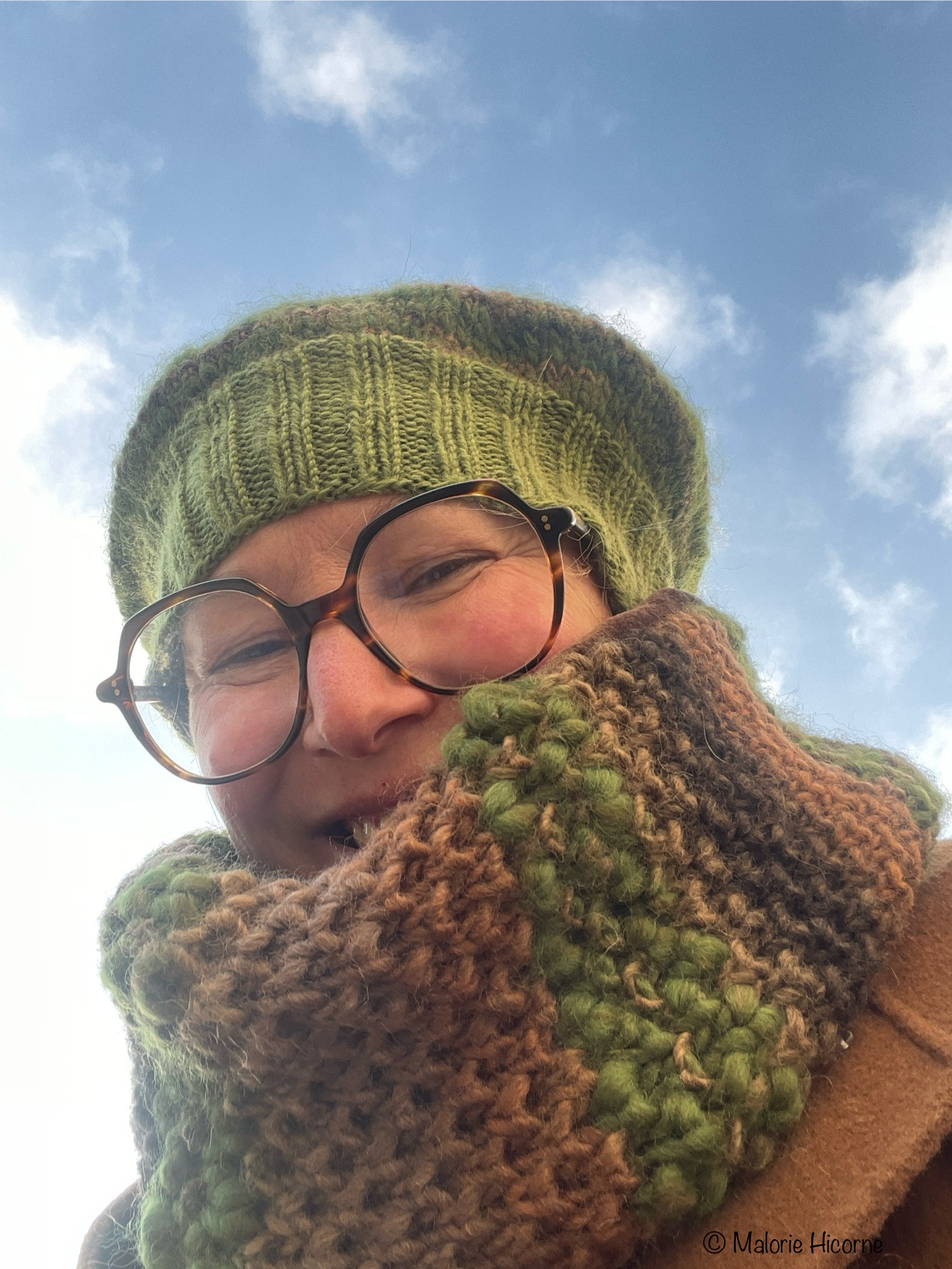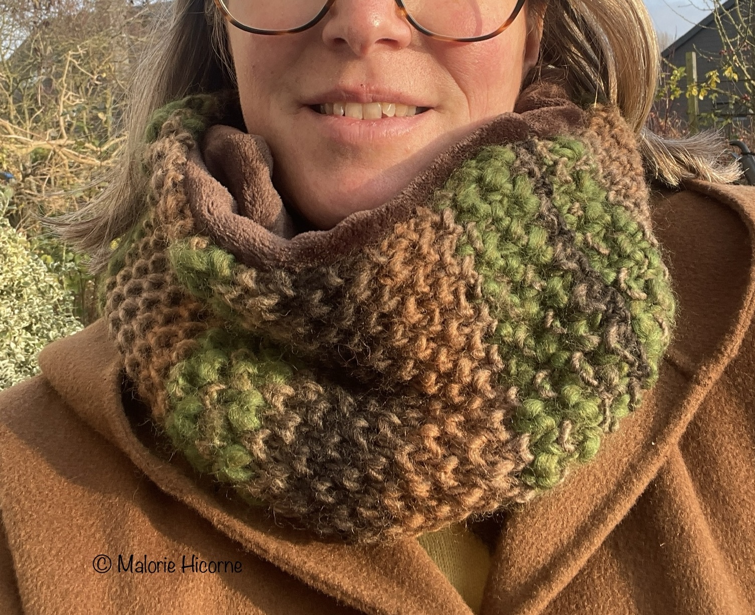 Un snood aux couleurs naturelles, marron et beige avec une mèche d’un vert profond.